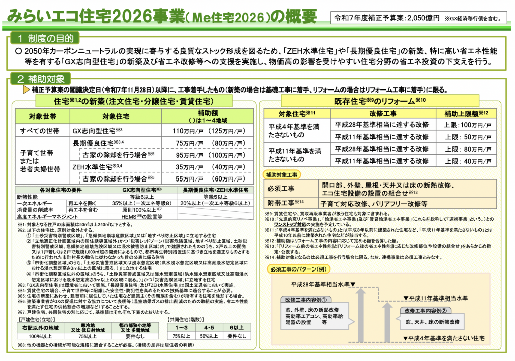 この弊社HPで紹介してる標準仕様で 十分に「GX志向型住宅」レベルに達しておりますので 是非 この補助金活用もおすすめ致します。 みらいエコ住宅2026事業の概要↓(クリックで拡大表示できます)